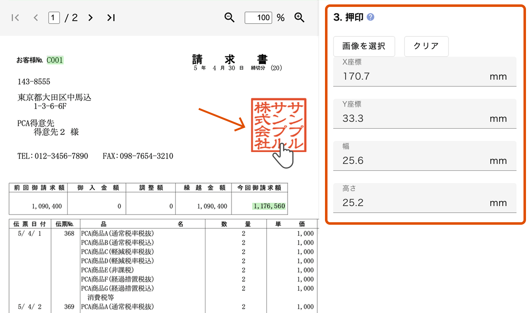 社印の画像をアップロードし、画面上で位置を設定した場所にPDF上で押印することができます。