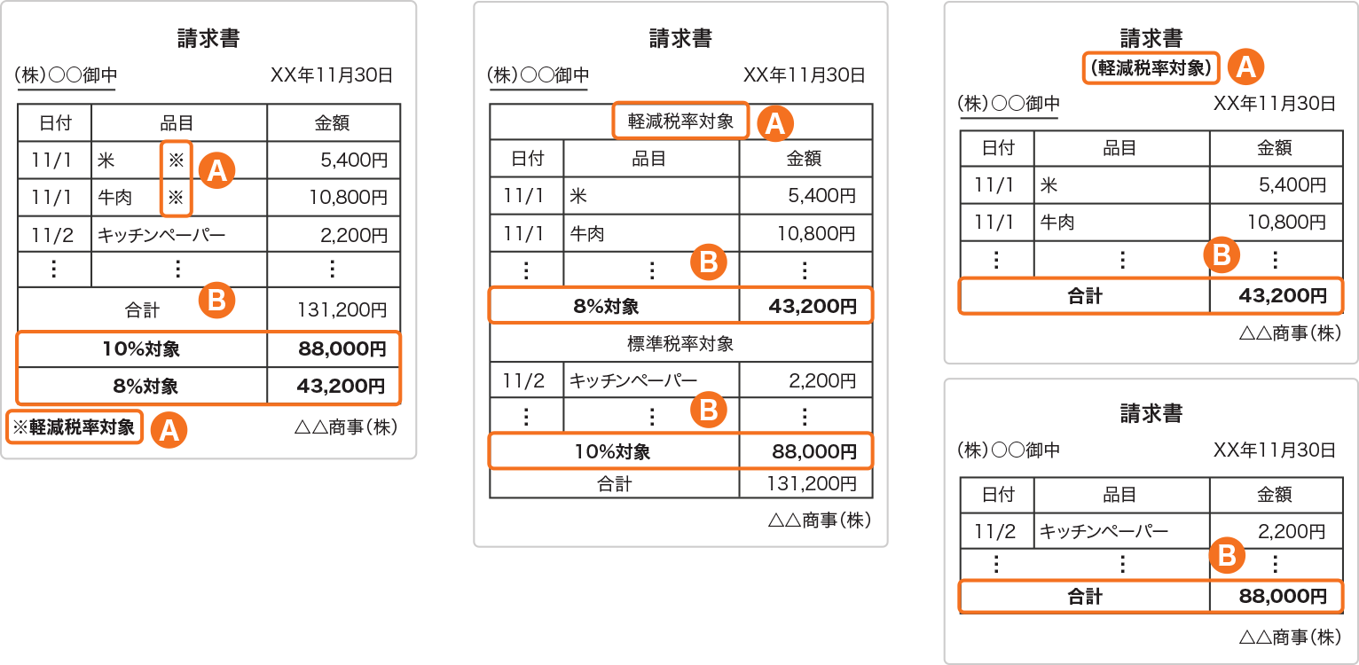 2019年10月からは、現行の請求書の記載事項に軽減税率(8%)の対象品目である旨と税率ごとの取引金額を追加した請求書等(区分記載請求書等)を取引先に交付する必要があります。