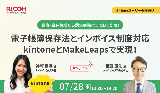 | 2022年07月20日 | 【開催済み】サイボウズ共催セミナー|電子帳簿保存法・インボイス制度対応kintoneとMakeLeapsで実現! |