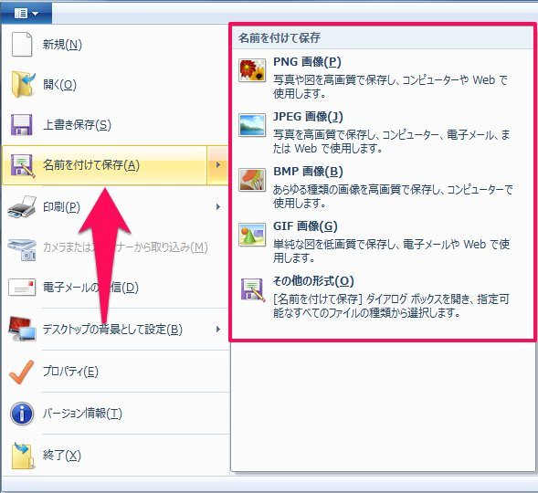 ツールバーの「名前を付けて保存」の右矢印をクリックすると、数種類のフォーマットが表示されます。その中から利用したいフォーマットを選択してください。あとは、ファイル名を付けて「保存」ボタンを押してください。